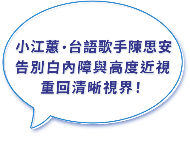 有小江蕙之稱的台語歌手-陳思安呼籲:白內障真的不能忽視!近視900度的我因為白內障,短短時間內度數飆到1500度,視力變的好模糊,還因看不清而跌倒受傷,真的讓我心驚膽跳。