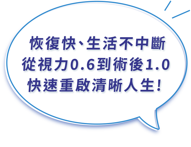 因為嚴重影響生活,決定接受恢復速度較快的「飛秒雷射白內障」手術。很幸運找到楊志盛醫師,他的專業讓我全程安心,手術快速順利,恢復也超乎想像,沒有疼痛,視力很快恢復清晰。