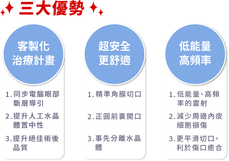 飛秒雷射採超高速擊發頻率(百萬赫茲,MHz),前囊環形切口緊密平滑;同時可快速雷射分割水晶體,降低手術風險,增加人工水晶體位置的置中平衡與穩定度。
