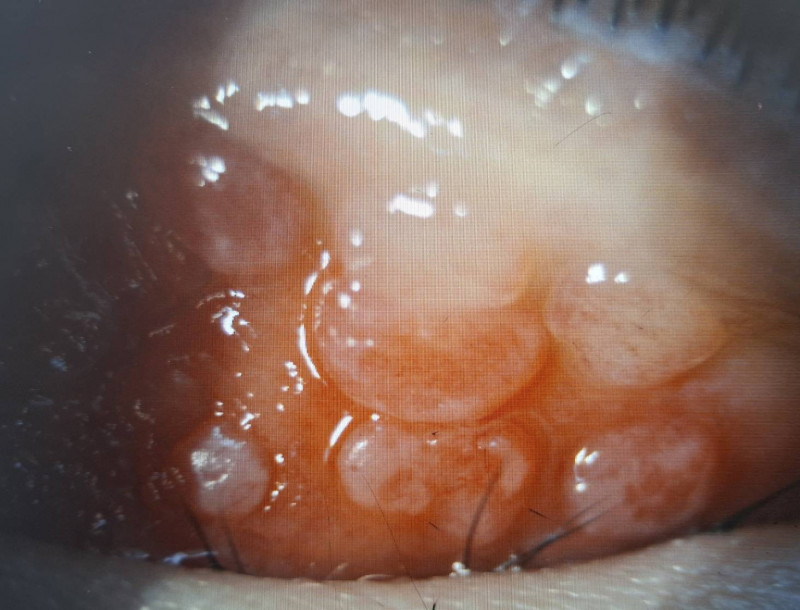 男童因結膜慢性發炎,使結膜上皮細胞的過度增生,長成大於0.1公分的乳突。(洪啟庭提供)